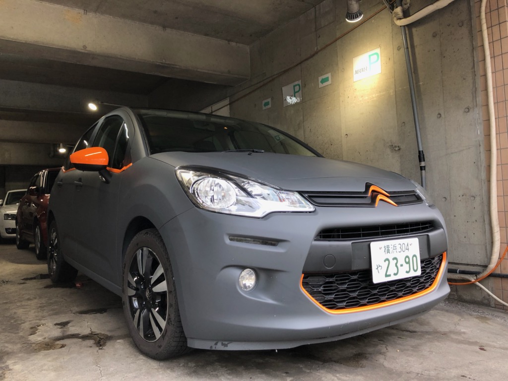 シトロエンマークの上半分をマットブラック、山を越えて半分をグロスオレンジで塗り分け♪
