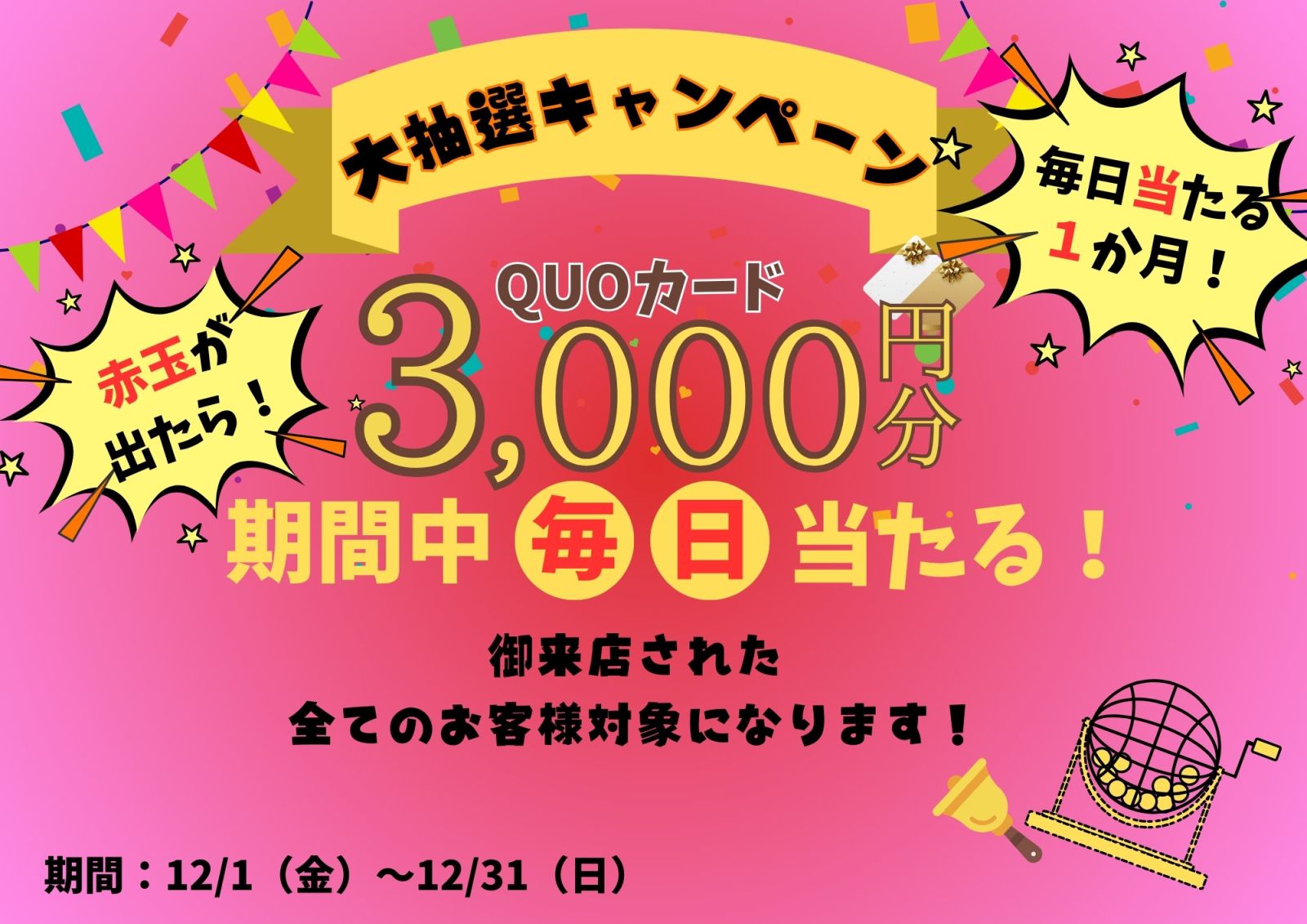 2023.12.02 12/1~12/31までのご来店いただいたお客様へ抽選会を開催!! カテゴリー: ご案内 ご来店いただいたお客様に抽選をおこなっていただき、 当たりがでたら、クオカード¥3,000円をプレゼント☆☆ ご家族、近隣の方をお誘いの上、是非遊びにお越しください!! ご来店、心よりお待ちしております。