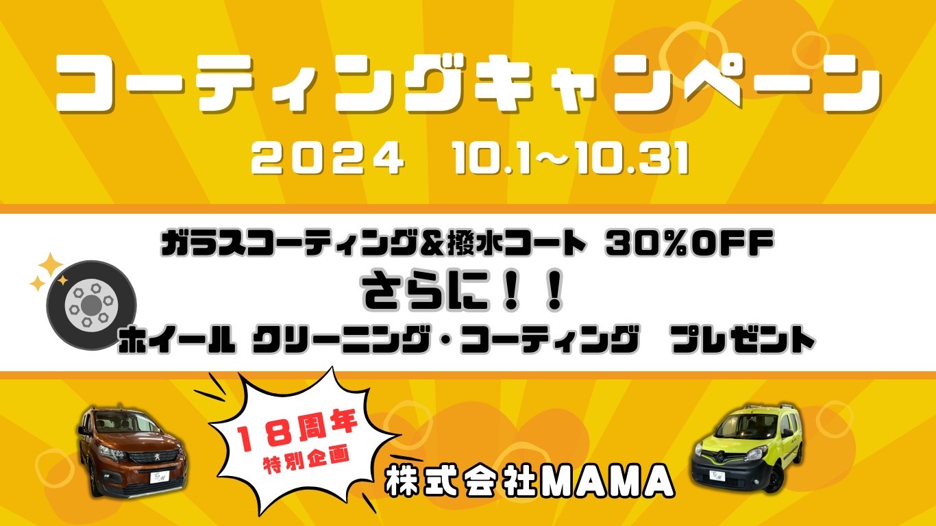 2024.10.01 株式会社MAMA18周年特別企画! カテゴリー: ご案内フランス車プジョーシトロエンルノーご挨拶 ☆株式会社MAMA18周年特別企画☆ ガラスコーティング&全ガラス撥水コートが30%OFF! さらにホイールクリーニング・コーティングをプレゼントいたします! 皆様のご来店スタッフ一同心よりお待ちしております!